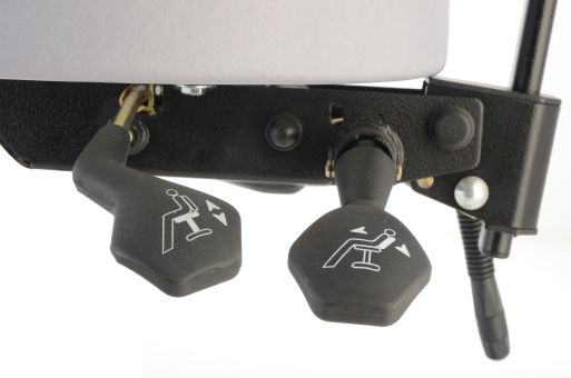 Speziell an diesem Hocker u.a.: Die Sitzfläche lässt sich mit einer Hebelmechanik um ca. 5° – 7° vorne nach unten neigen/kippen.