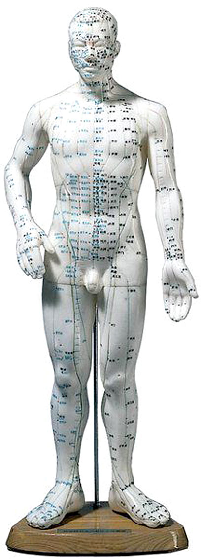 Übungsmodell männlich ca. 49,5 cm hoch. Auf diesem verkleinerten Menschenkörper sind alle Meridiane farbig dargestellt und ebenso wie die Akupunkturpunkte eingraviert.